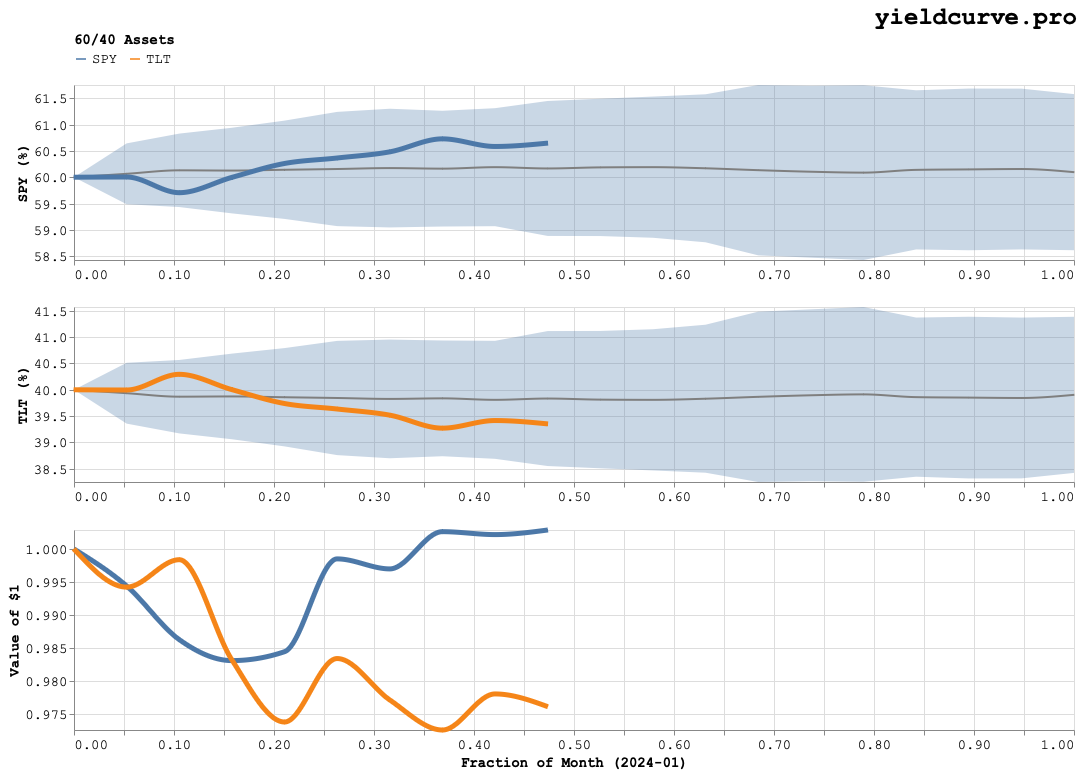 This is January 2024 installment of a series of post we make to track how the weights of a synthetic 60/40 stock/bond portfolio evolve intra-month. Find last month's post here.