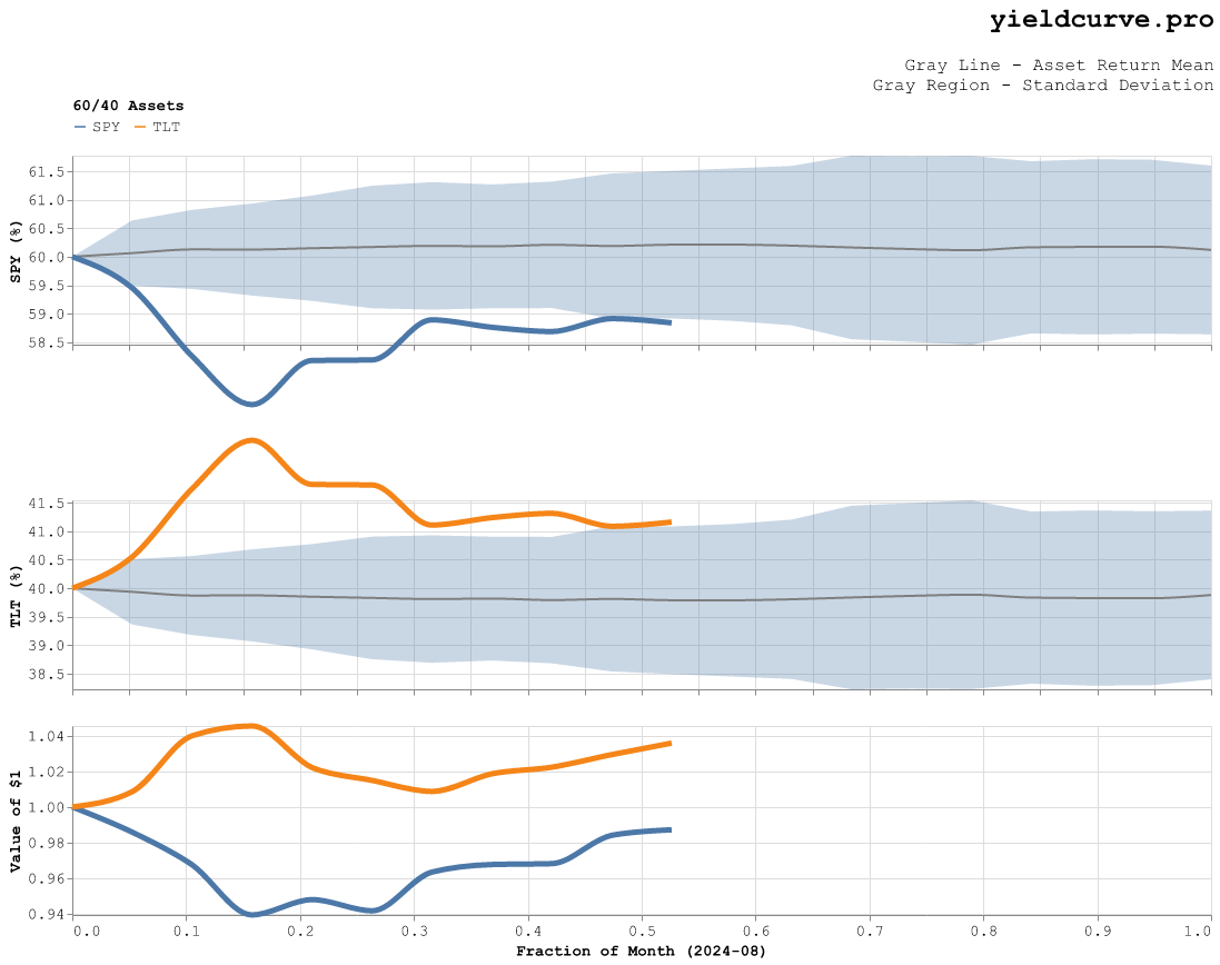 This is the August 2024 installment of a series of posts we make to track how the weights of a synthetic 60/40 stock/bond portfolio evolve intra-month.