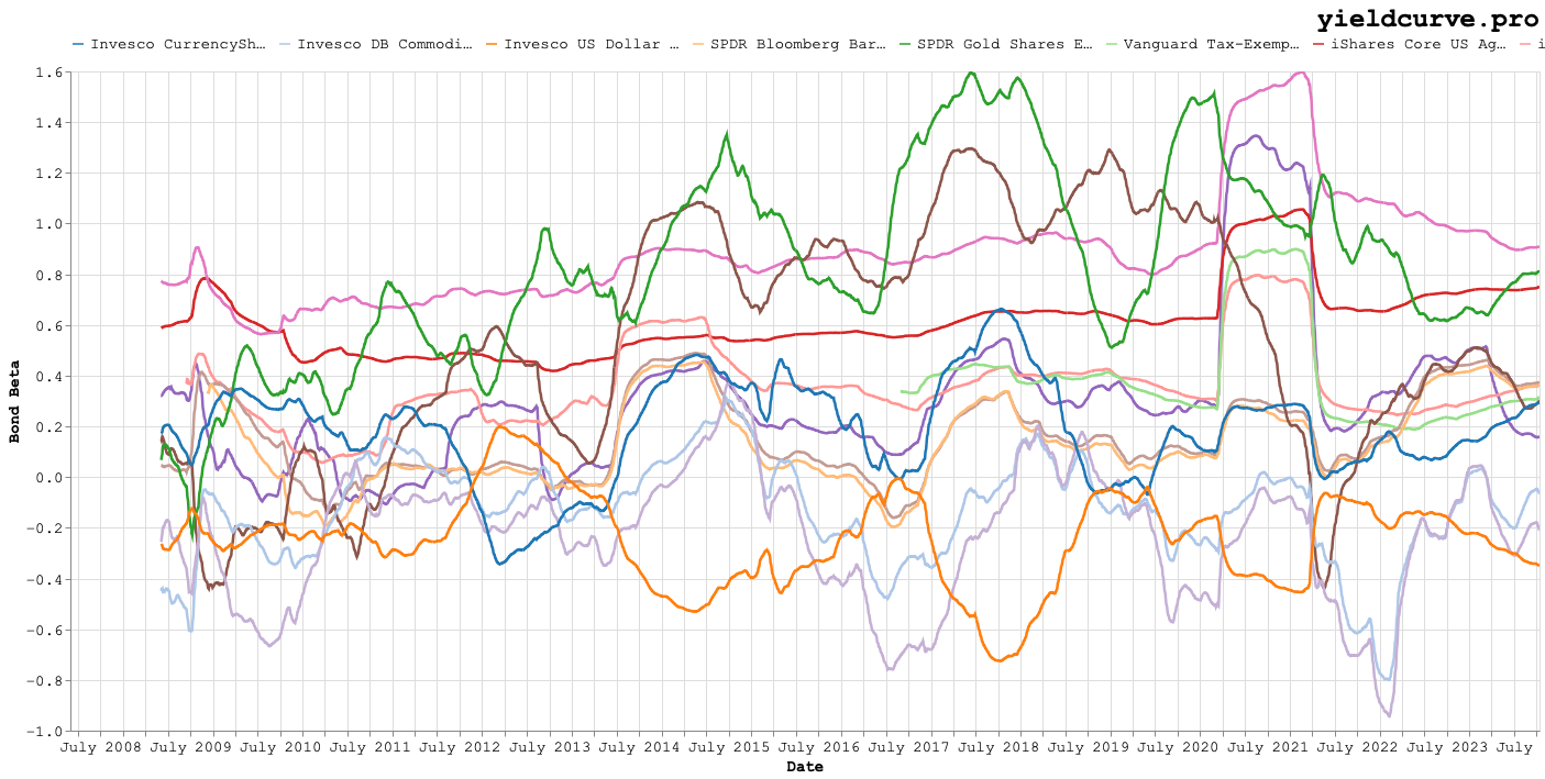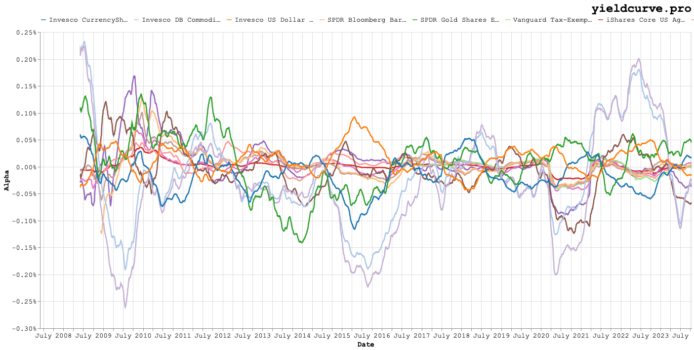 Munis, junk bonds, and preferred stock all seem to add alpha with limited exposure to stocks and rates. Both FXE and UUP suggest that exposure to the dollar relative to a basket of foreign developed currencies adds alpha while be also adding diversification.