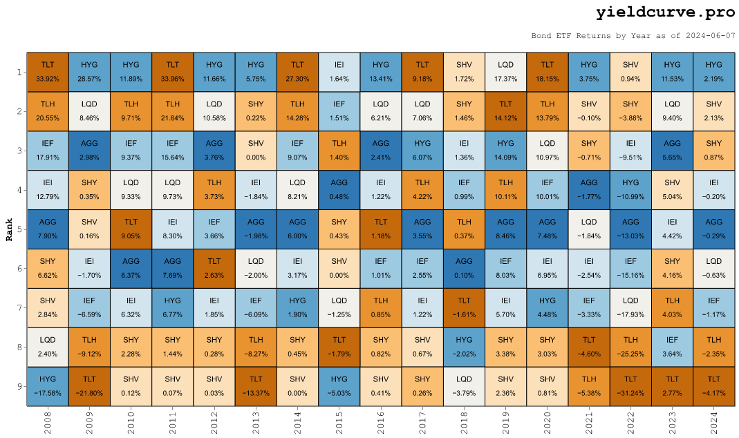 The right most column reports 2024 YTD returns. Excluding this year, it is interesting to note that HYG and TLT have occupied the top spot 12 out of 16 times with each holding that position 6 times.
