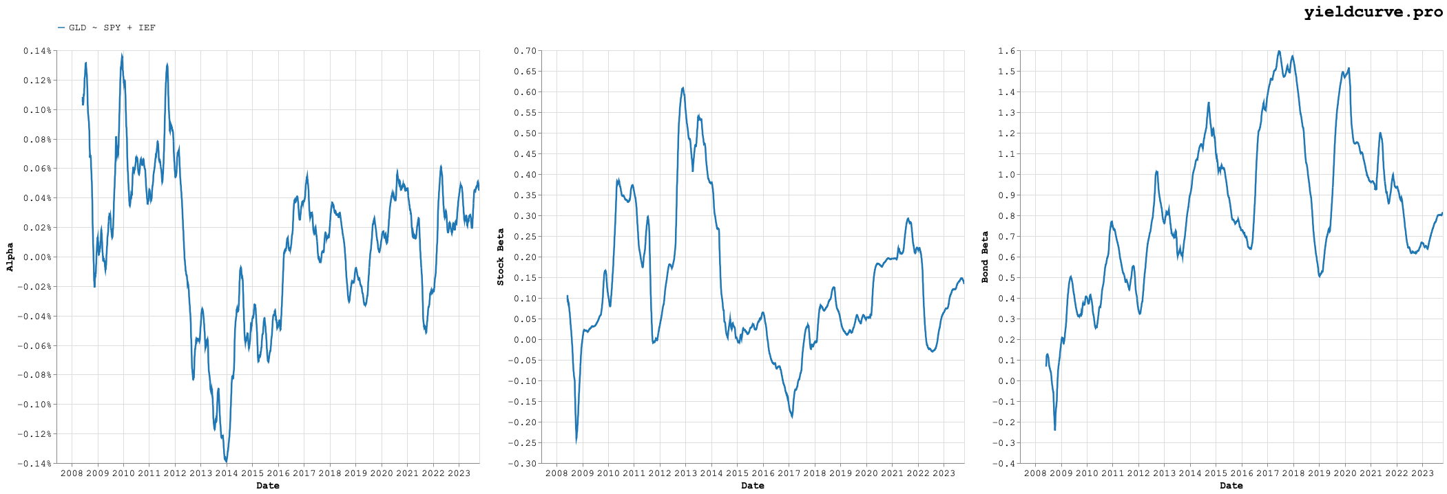 TLT holds Treasury bonds with tenors in the 20 year range. This boosts alpha by roughly 100 basis points to sit around 283. This results in essentially the same stock exposure but with a significant reduction in bond beta. This is a diversifying addition and there do seem to be synergies adding gold in this case. Good call Bob!