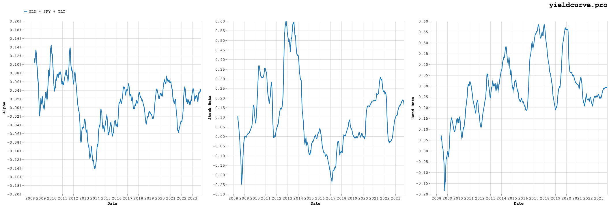 $$ r_{gt} - r_f = \alpha_g + \beta_{m}\left(r_{mt} - r_f\right) + \beta_{b}\left(r_{bt} - r_f\right) + \epsilon_{gt} \qquad\qquad\qquad\qquad (1) $$ where $$r_{gt} := \text{gold return}$$ $$r_{mt} := \text{stock market return}$$ $$r_{bt} := \text{bond market return}$$ $$r_f := \text{risk free rate}$$ $$\alpha_g := \text{intercept}$$ $$\beta_{m} := \text{stock market exposure}$$ $$\beta_{b} := \text{bond market exposure}$$