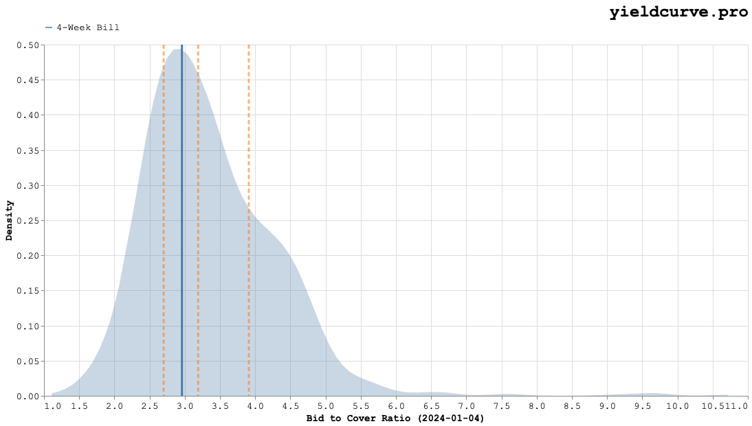 In the last post we touched on the Bid-to-Cover (BTC) ratio which is a statistic that compares the total dollar amount of bids over the dollar amount of bonds sold. A BTC of 1 implies that supply (in the form of the dollar amount UST hopes to raise) was exactly matched by demand (the bids sought by auction participants). Healthier auctions should have BTC a far above 1 as possible.