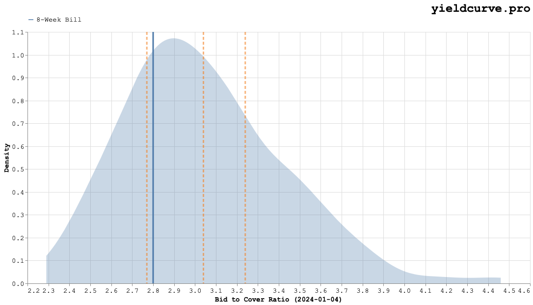 The the 8-Week Bill BTC is well below both the mode and median yet greater than the 25-th percentile. For both tenors it appears that the most recent auctions were below historical expectations. This suggest auction health has deteriorated recently. We will be keeping a close eye on today's auctions and assessing where they fall in either tenors' DDD.